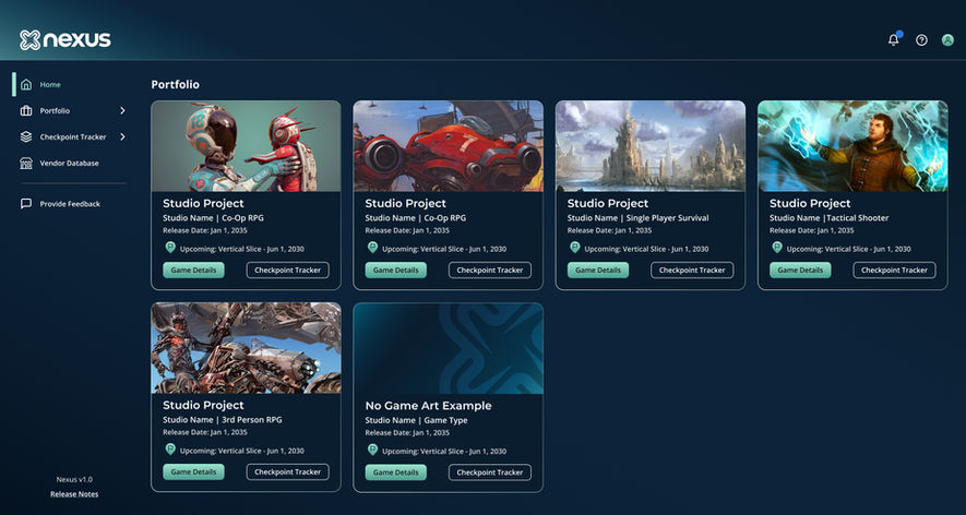 The Portfolio page was designed as the landing page for Nexus' Optimal First Release, serving as the entry point for all users, including Team Members, Executive Leadership, Studio Leadership (Creative & Production), PM Core Leadership, and Administration. The page provides a comprehensive overview of all games in production and their progress. Users can access detailed information about a selected game through the left-aligned navigation, or visit the tracker page to interact with game assets and monitor progress.